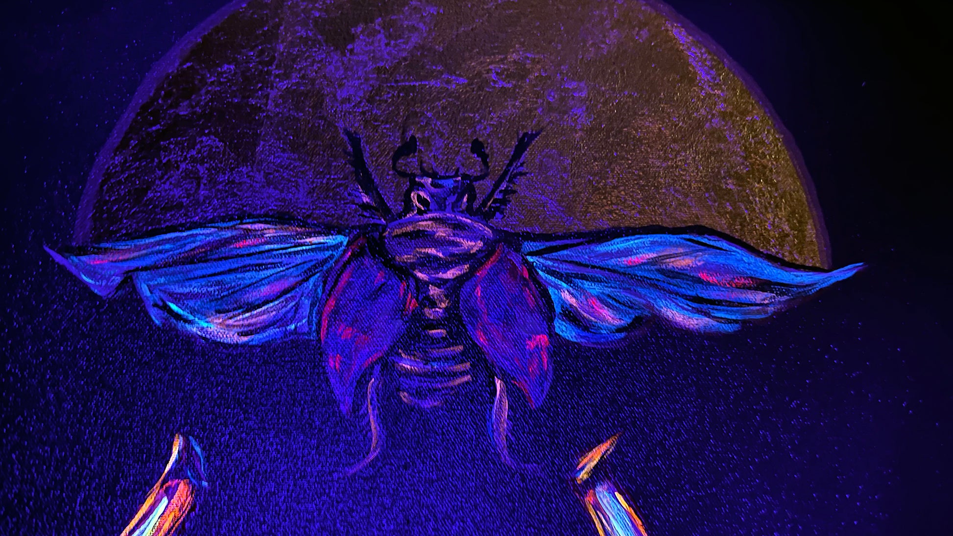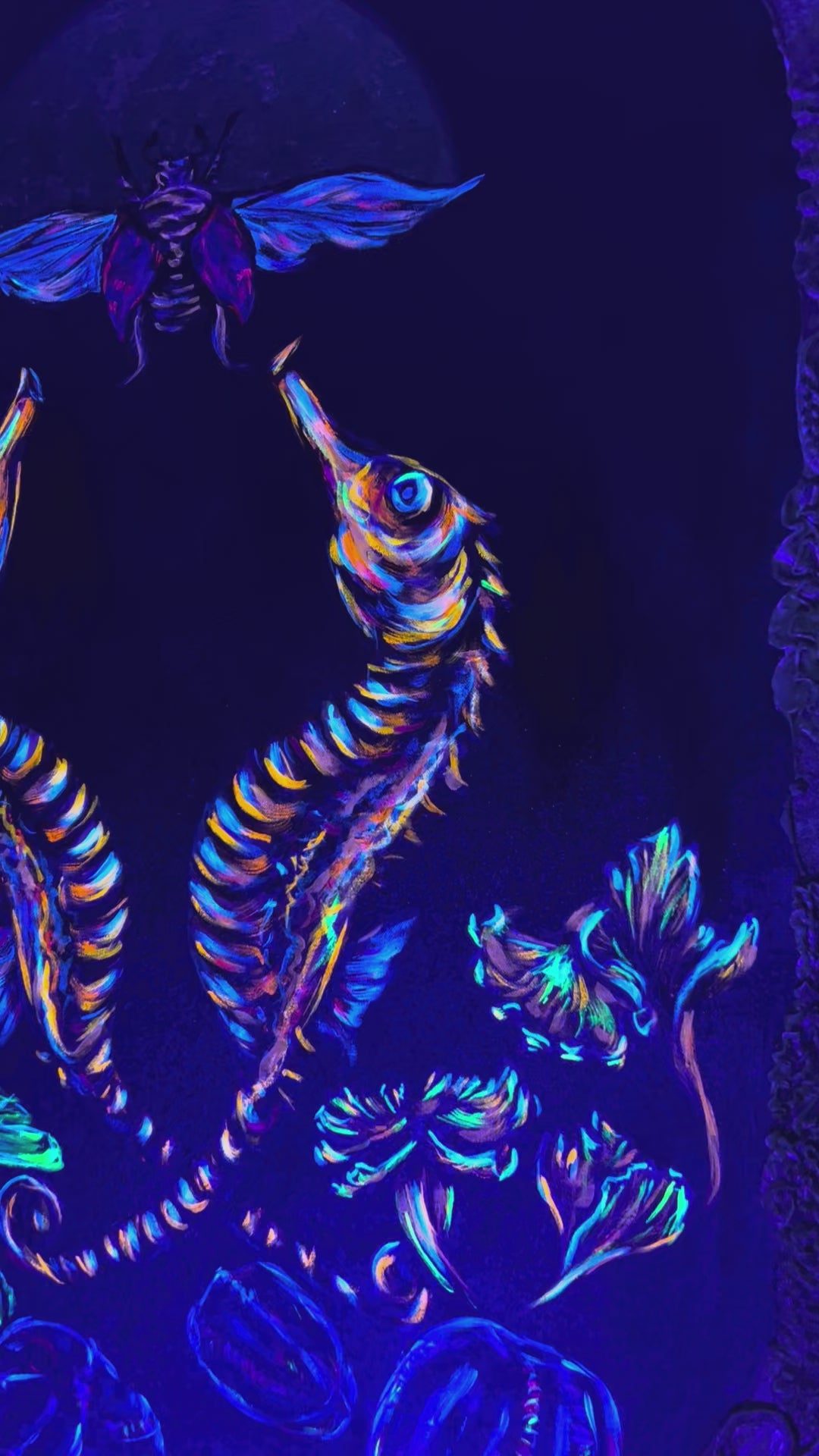 My take on the classic painting "Resurrection." Nature inspired, sea horses facing a scarab beetle holding a gold leaf sun, ginkgo leaves, chanterelle mushrooms, deep sea walnut comb jellies, gold textured coral reef frame.
