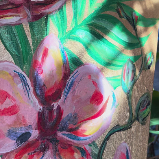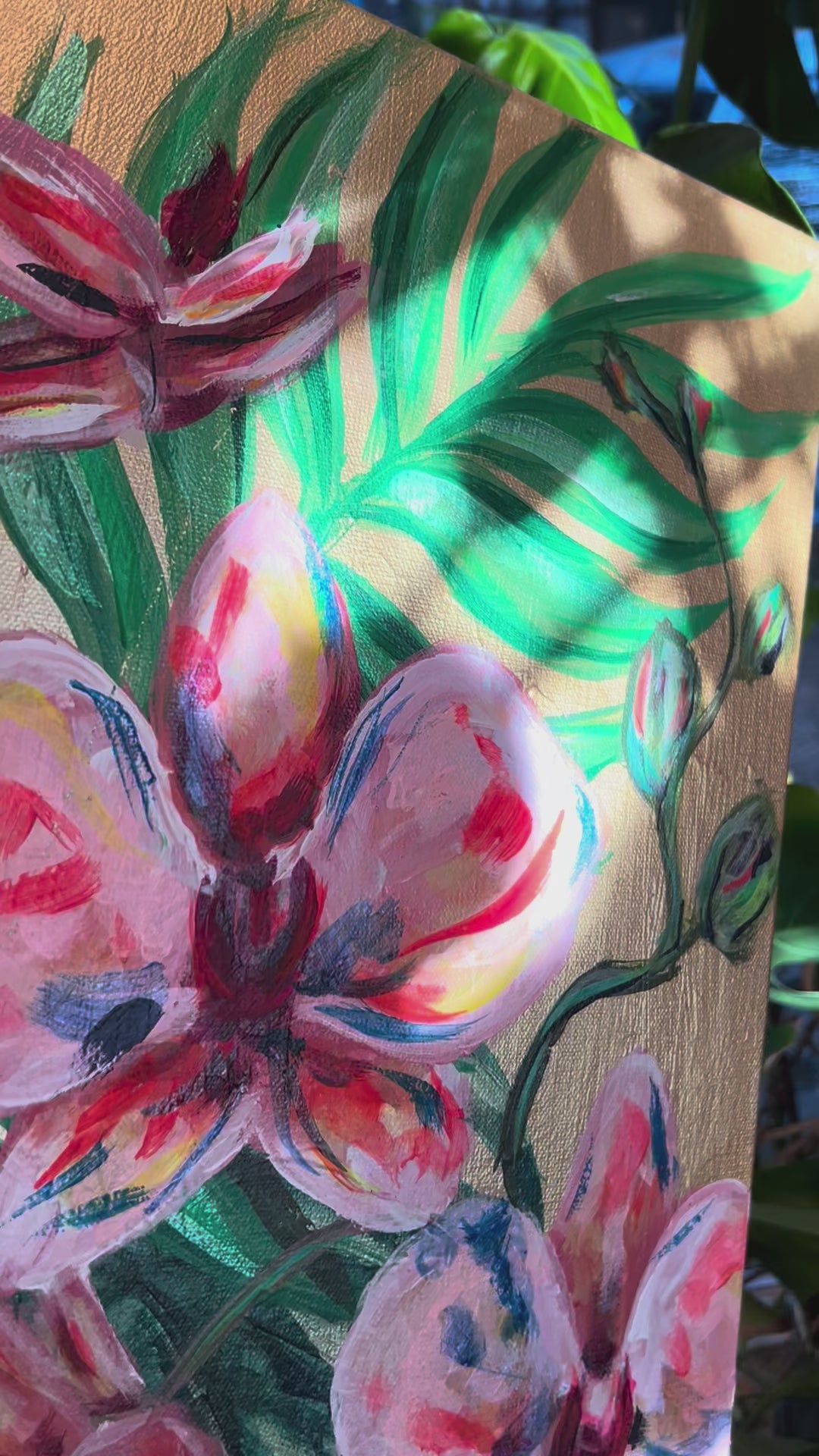 Original, one of a kind painting of orchids and tropical plants on a gold back ground.