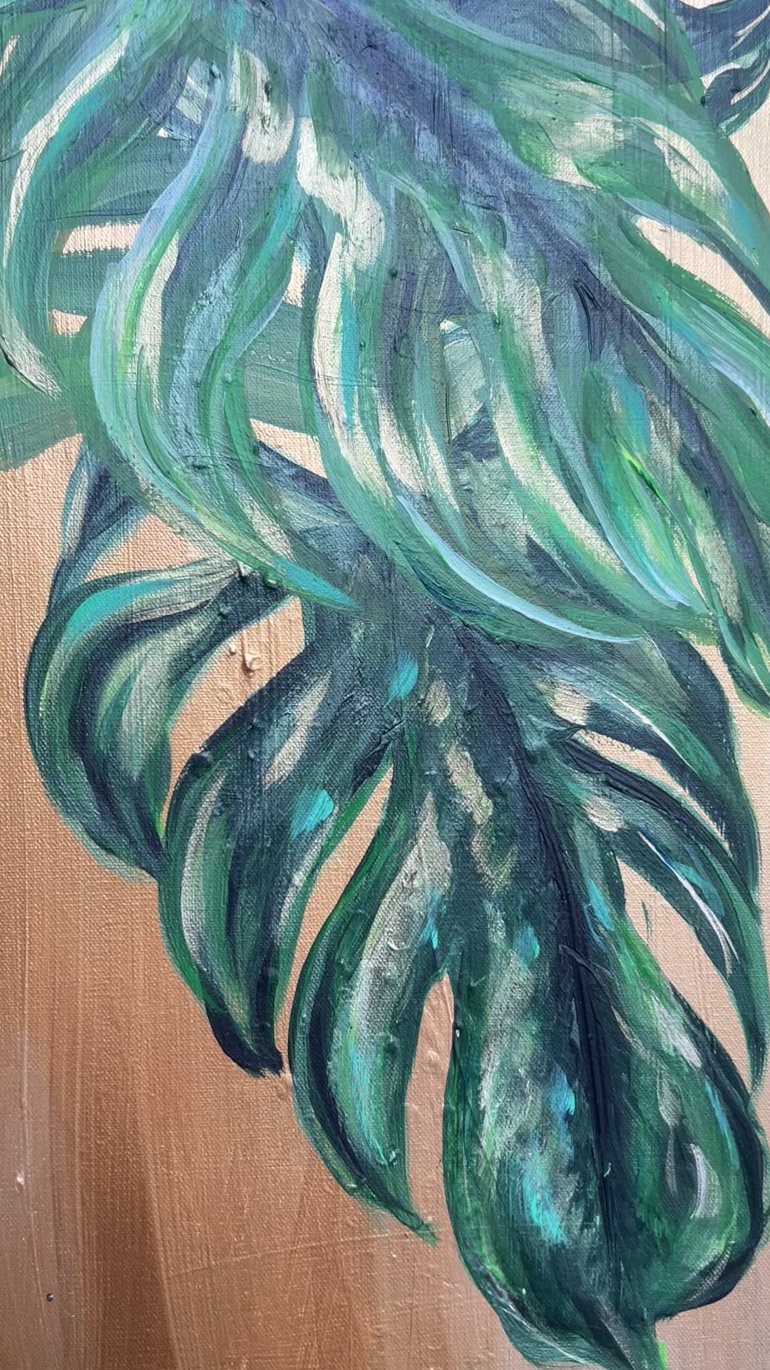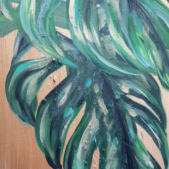 Original, one of a kind painting of tropical plants on a gold back ground. Uv reactive